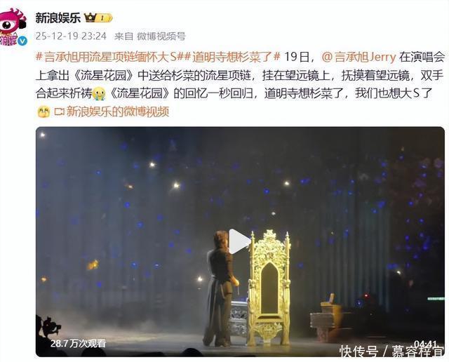 12月19日晚,上海“恒星之城”演唱会舞台上,一场精心设计的无声仪式,击穿了无数人的时光壁垒。由言承旭、周渝民、吴建豪与五月天阿信组成的“FForever”组合迎来全球首秀,而在言承旭的个人表演环节,他取出《流星花园》中的两件经典道具——流星项链与望远镜,完成了一次被全网解读为“献给大S”的静默悼念。       没有一句台词。言承旭只是将那条在剧中作为道明寺送给杉菜定情信物的流星项链,轻轻悬挂在望远镜的镜筒上,随后闭目合十。这一举动精准复刻了《流星花园》第29集“观星定情”的名场面,却完成了关键的情感变奏:道具从剧中象征亲密羁绊的“颈间佩戴”,转变为此刻充满距离感的“孤悬镜筒”。这一视觉转变,被观众瞬间解读为“跨越生死的对话”。全程的留白与他在演唱《我是真的真的很爱你》时强忍泪水的微表情交织,形成一股强大的情感引力,被赞“无言胜万言”,深刻契合了文学中“深情无需赘言”的表达逻辑。       这个符号承载着双重重量。它既是剧中道明寺与杉菜未竟之恋的经典回声,更是现实中言承旭与大S二十三年真挚友情的见证。大S生前多次在言承旭低谷时给予深夜通话疏导,而言承旭也曾于2025年8月冒台风赴台为其扫墓,在墓前静立落泪十余分钟。项链与望远镜的组合,就此串联起虚构的青春记忆与真实的生死离别。       事件瞬间引爆80、90后的集体记忆。社交平台上,“DNA动了”、“回忆杀”成为高频词。流星项链从一部偶像剧的信物,升华为一代人青春岁月的纪念章。无数网友感慨:“我们哭的不是八卦,而是自己也曾相信‘道歉有用要警察干嘛’的纯粹年代。”与此同时,此次以朱孝天缺席而事实上形成的“F3”重组巡演首秀,也因这一环节,被赋予了别样意义——它仿佛成了初代偶像剧文化符号在现实舞台上的最后一次盛大而哀伤的闪耀。       言承旭此举,无意间开创了一种“以符号替代煽情”的偶像悼念新范式。在社交媒体时代,它提供了一个极度浓缩却充满张力的怀旧样本。当道具脱离剧情,被置于现实的生死语境中,它所激发的已不仅是观众对某个角色的怀念,更是对自身已逝青春、以及对生命中那些重要告别的一次集体回望与祭奠。舞台上的静默片刻,最终化为了互联网时代一场汹涌的、关于爱与失去的公共记忆共鸣。